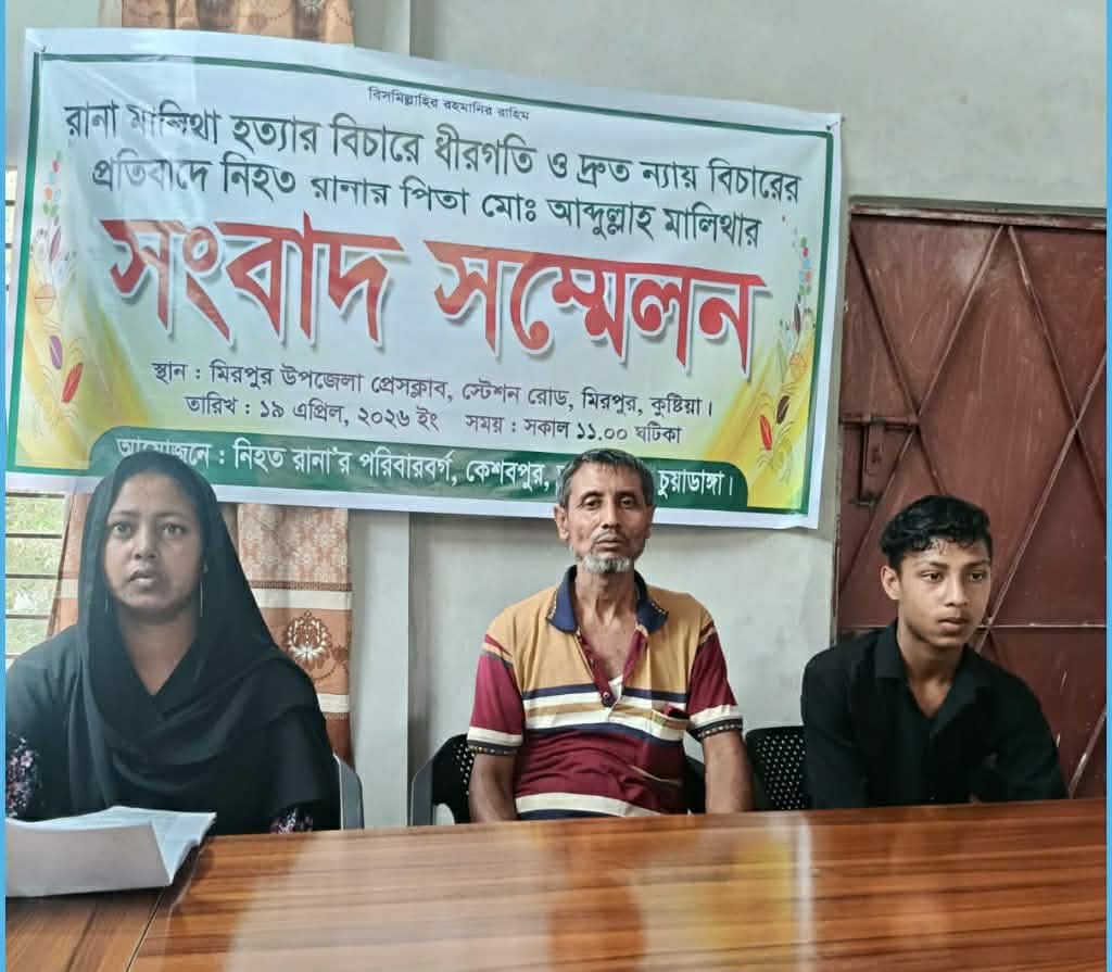 সংবাদ সম্মেলনে নিহতের পিতা মো. আব্দুল্লাহ মালিথা লিখিত বক্তব্য পাঠ করেন। তিনি অভিযোগ করেন, চুয়াডাঙ্গার আলমডাঙ্গা উপজেলার কেশবপুর এলাকার তরুণ রানা মালিথা হত্যাকাণ্ডের ঘটনায় একাধিক আসামি গ্রেপ্তার হলেও মূল অভিযুক্ত ব্যক্তি এখনো ধরাছোঁয়ার বাইরে রয়েছে। এতে করে ন্যায়বিচার প্রাপ্তি নিয়ে গভীর উদ্বেগ ও অনিশ্চয়তার মধ্যে দিন কাটাচ্ছে পরিবারটি।